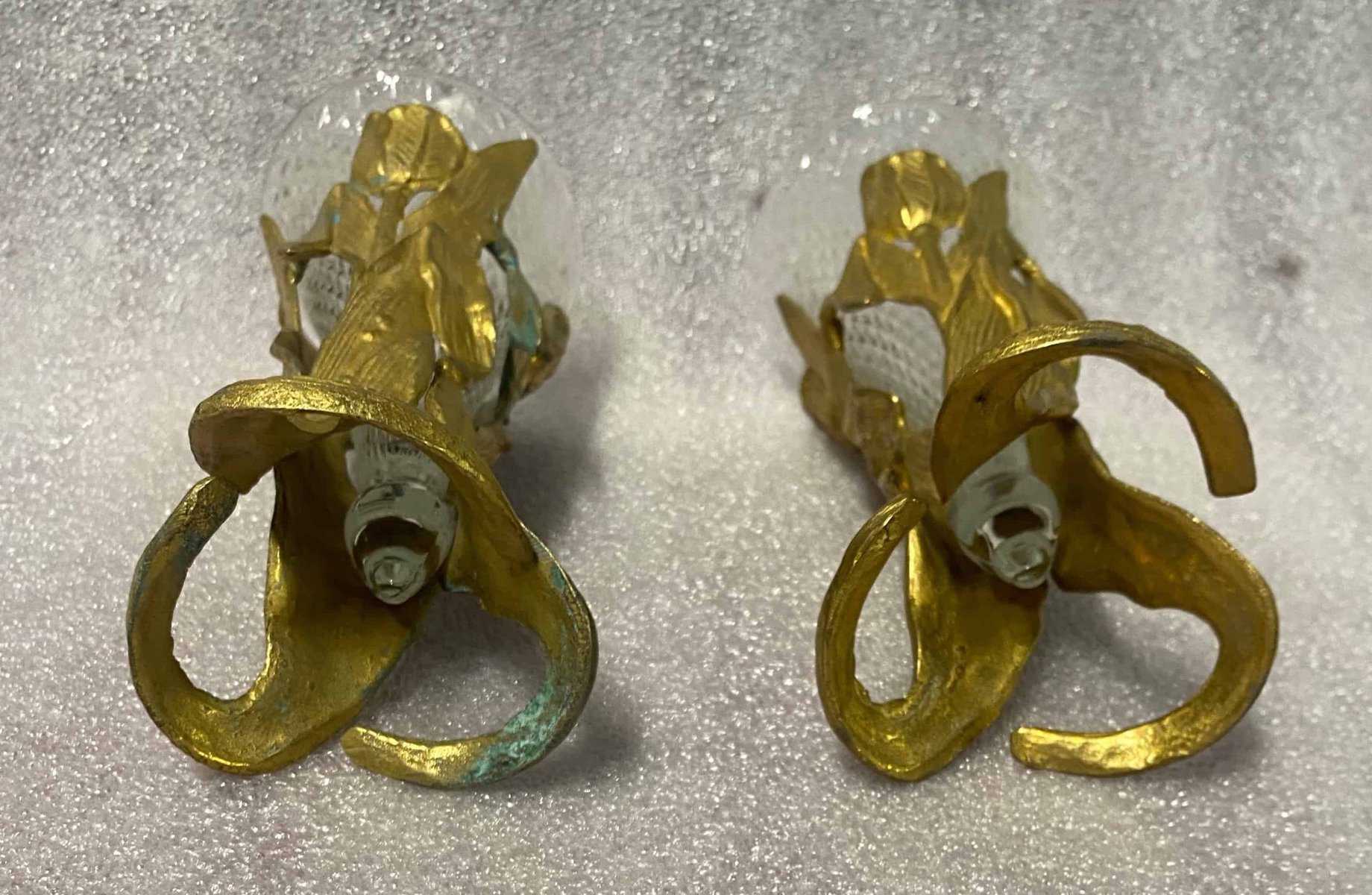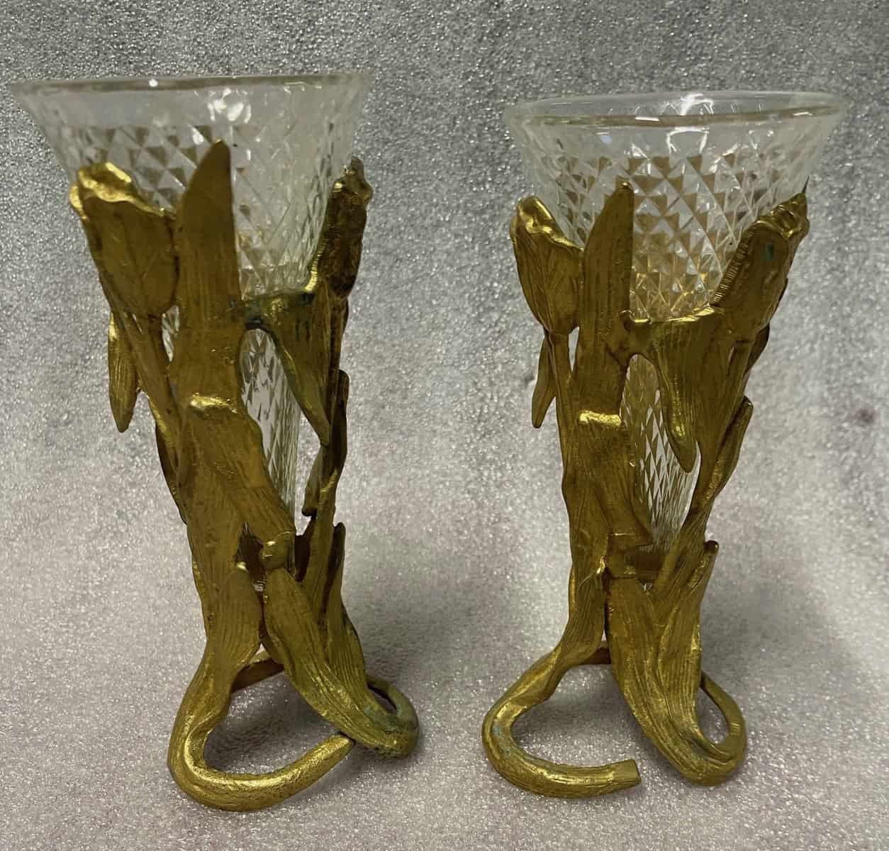 1900′ Paire De Pics Fleurs En Bronze Avec Cornets Cristal Pointe De Diamants