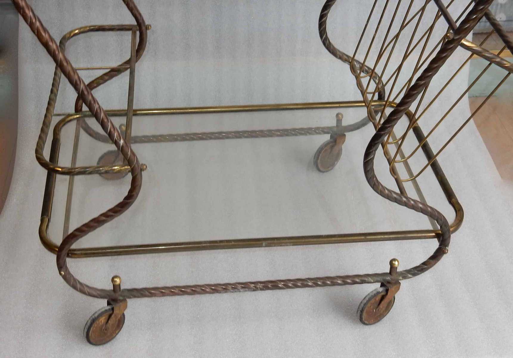 Bar roulant décor Art Nouveau avec 2 plateaux à verre, Circa 1950, En état