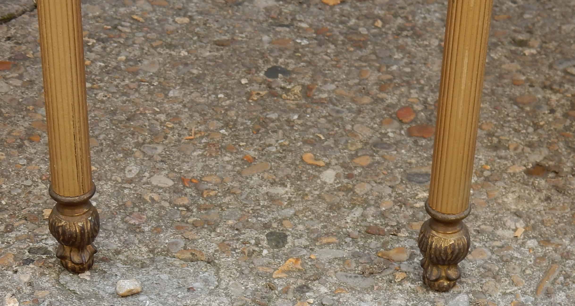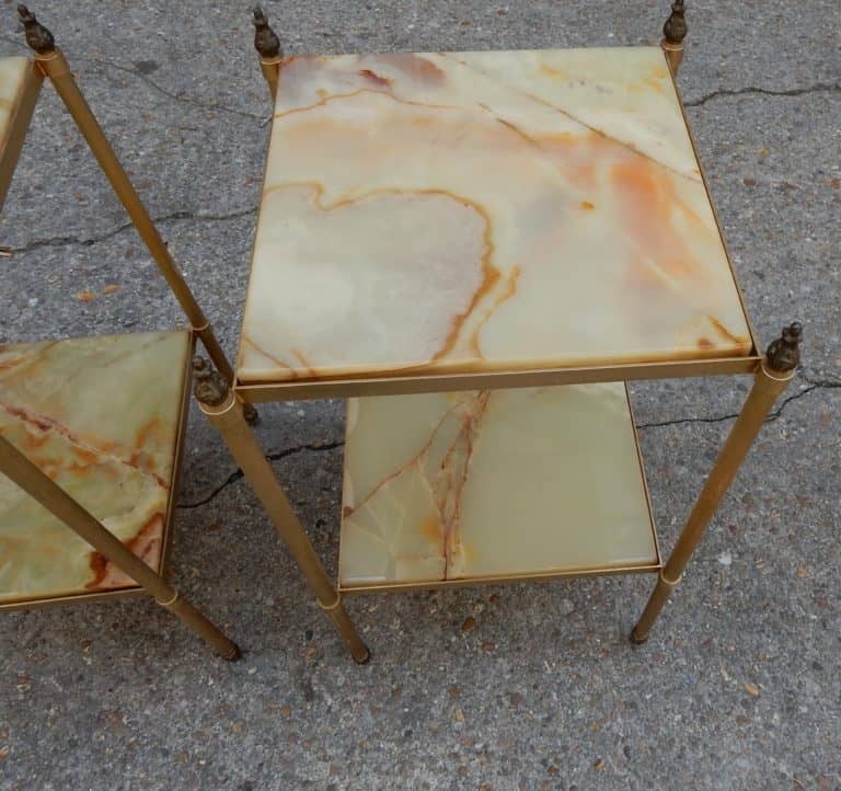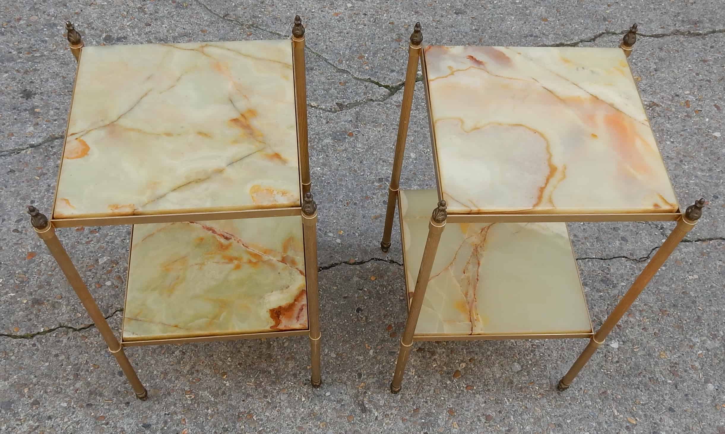 Paire de bouts de canapés avec structure en bronze doré, avec flammes olympiques, plateaux en onyx, Circa 1970, bon état, pieds sculptés