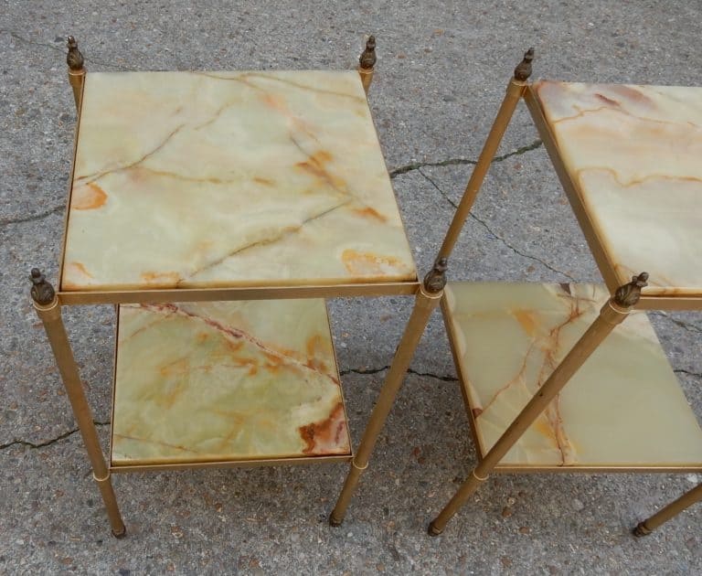 1950/70′ Paire de Bouts de Canapés en Laiton Doré Avec Flammes Olympiques Plateaux Onyx Maison Baguès 34 X 34 cm