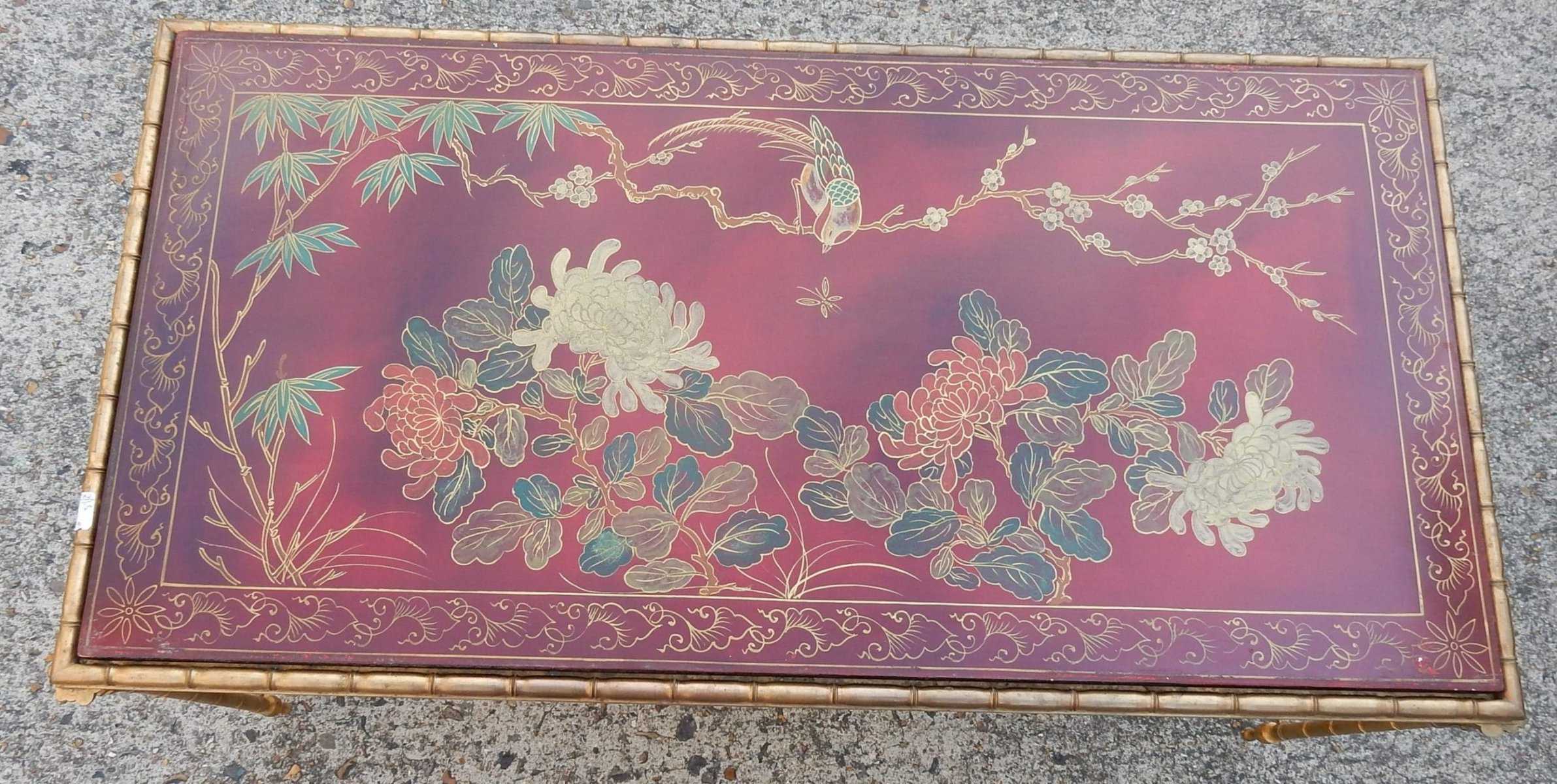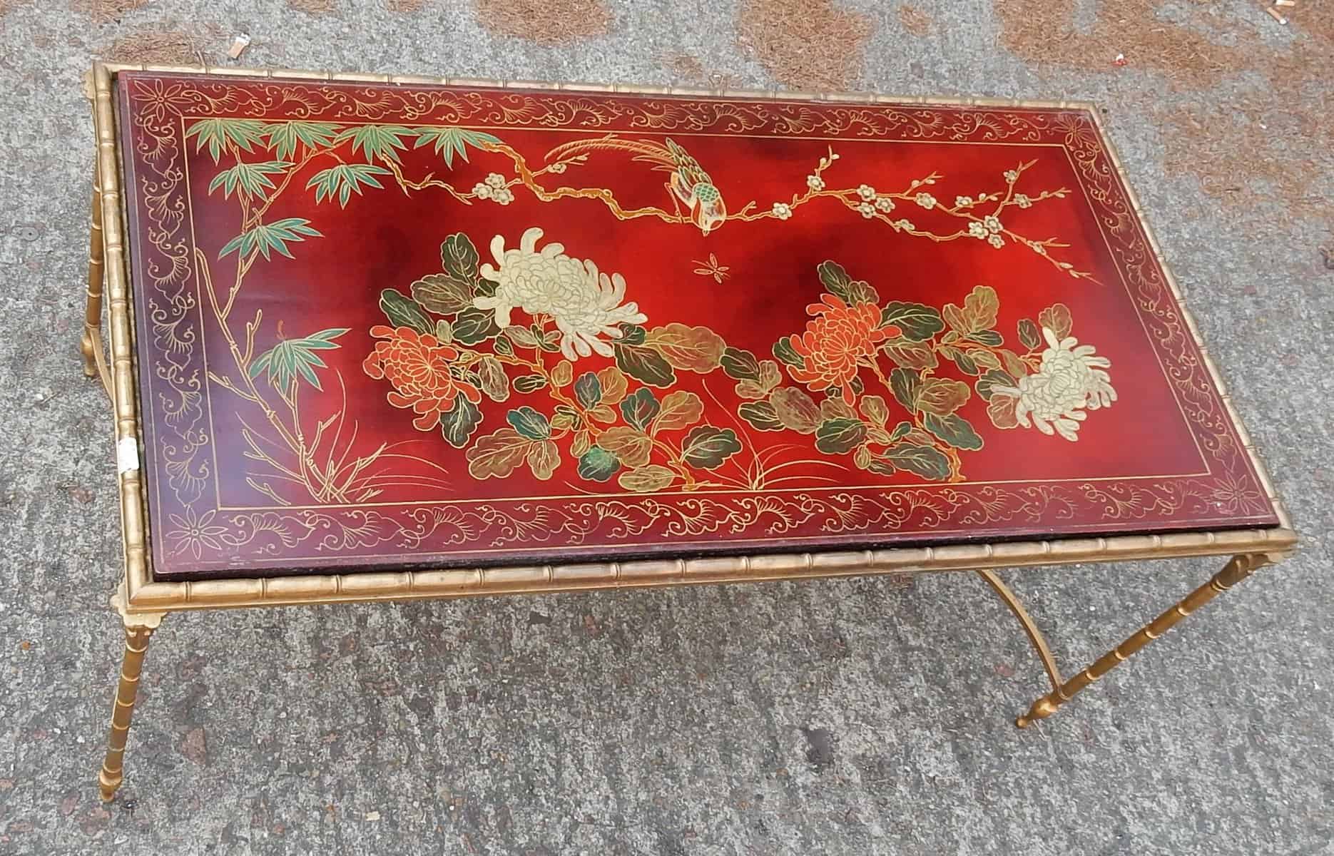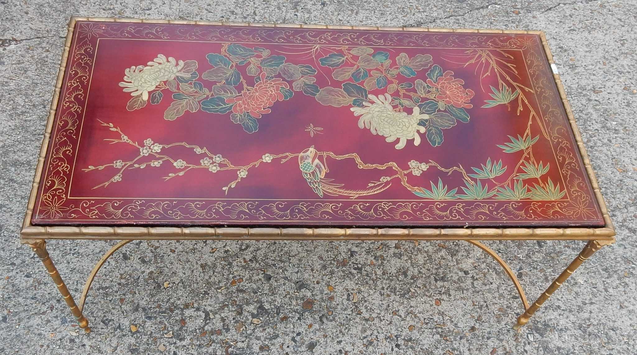 Table basse en bronze doré avec montants se terminant par des cimes de palmier le plateau est décoré de fleurs et d une perruche, laque de chine