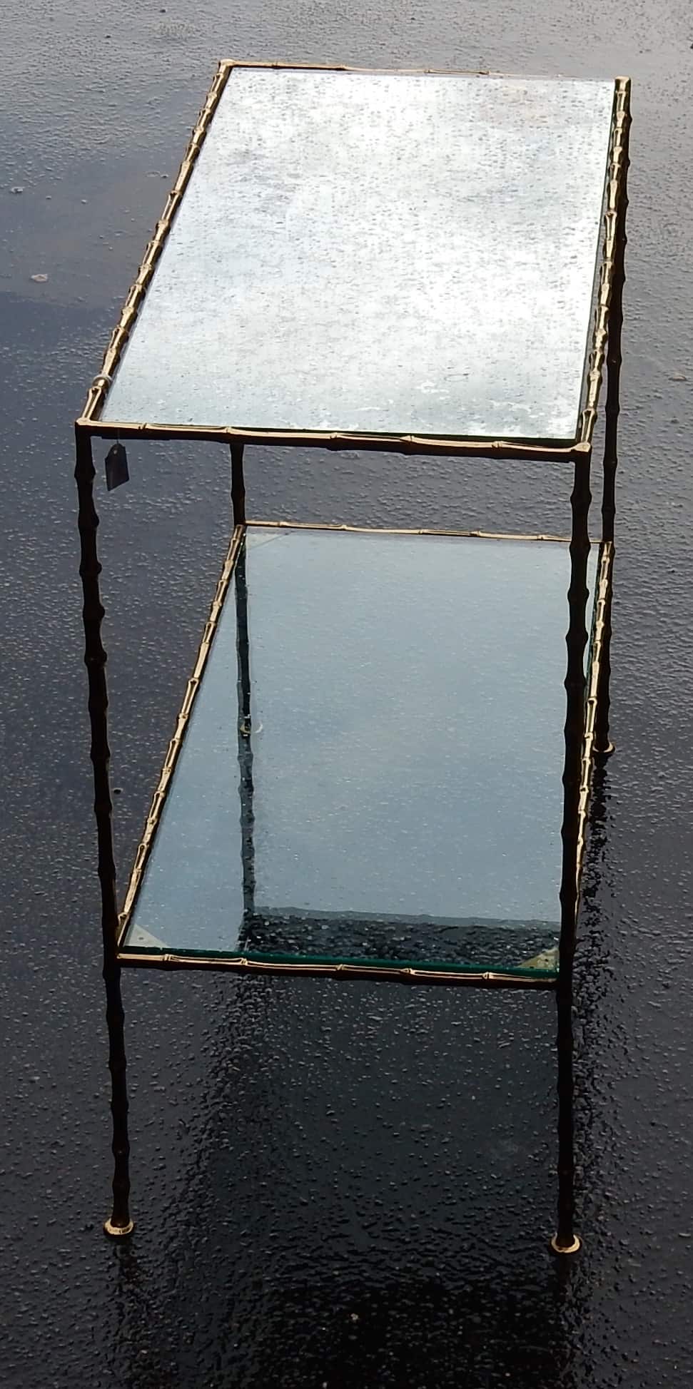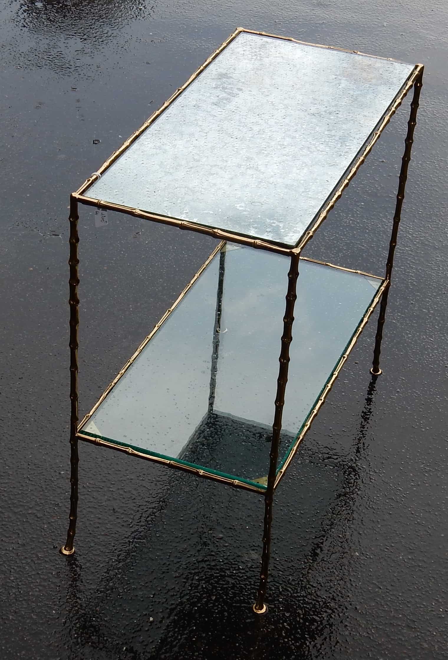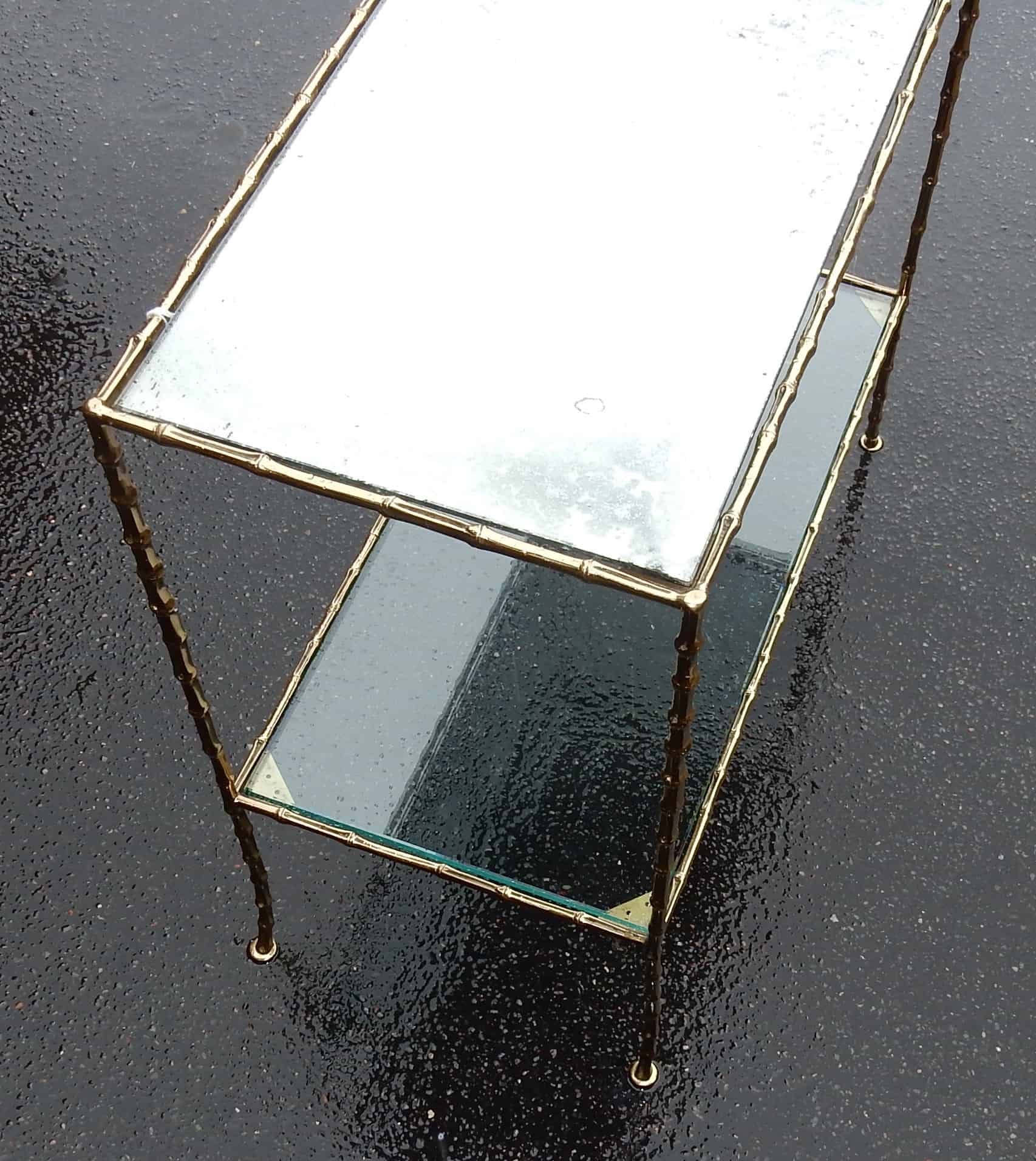 Table d’appoint en bronze avec 2 plateaux en miroirs oxydés argentés, Maison Bagués modèle bambou.