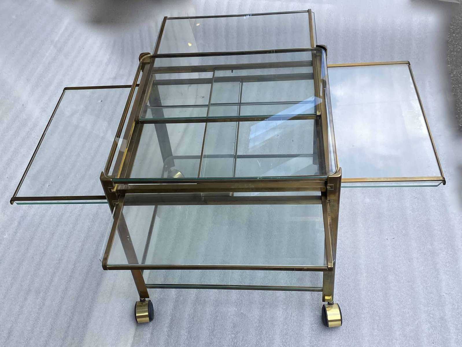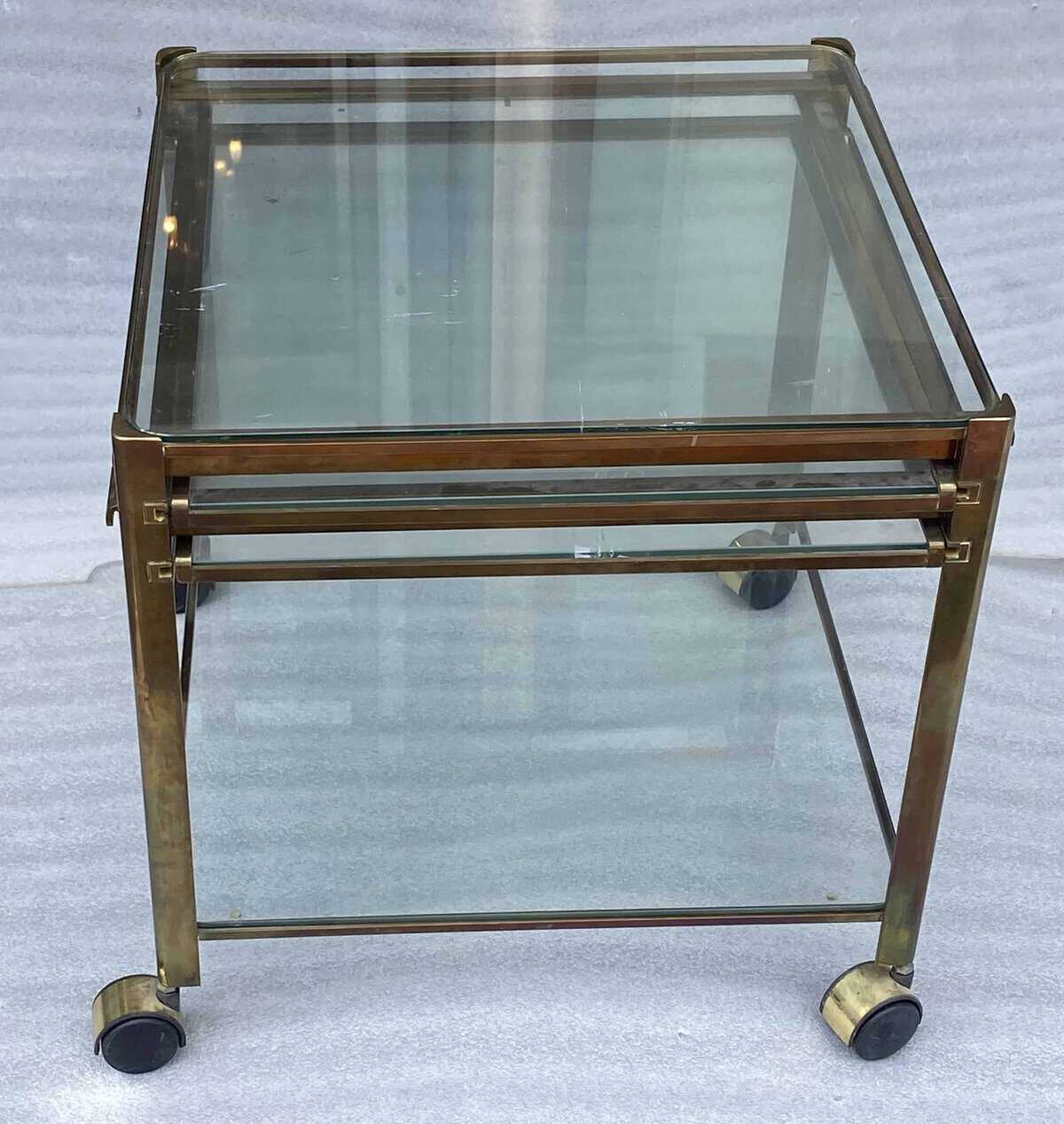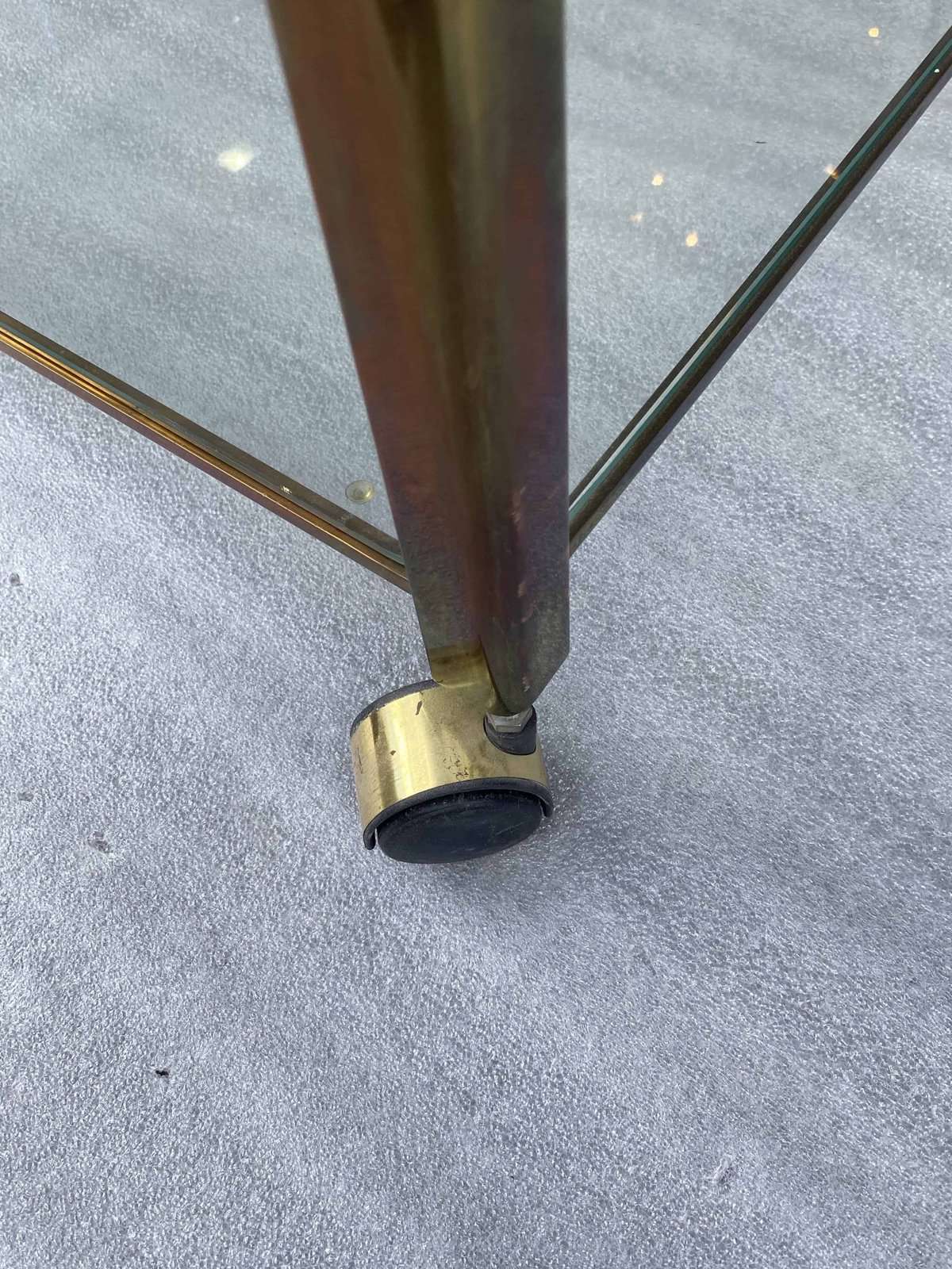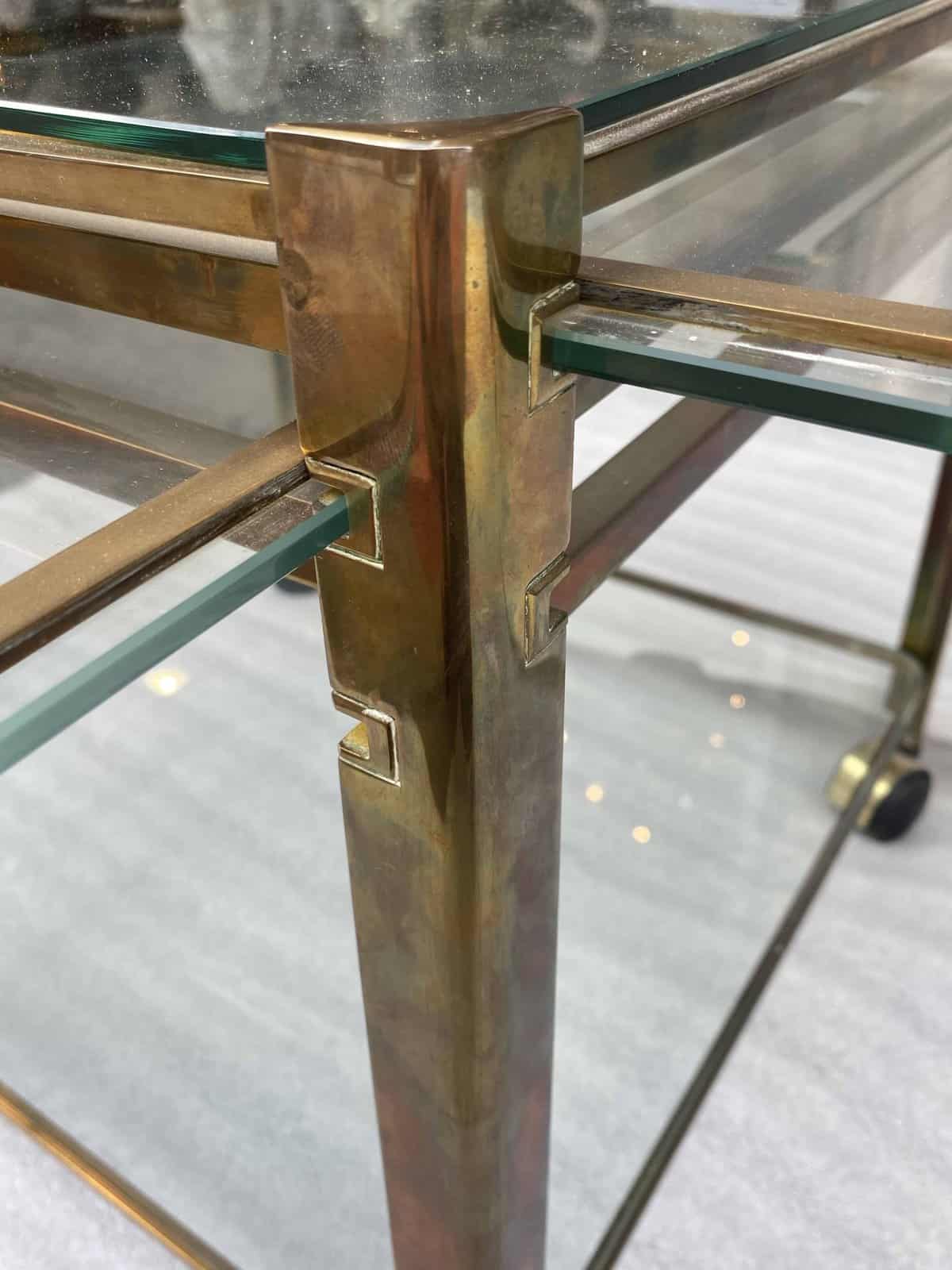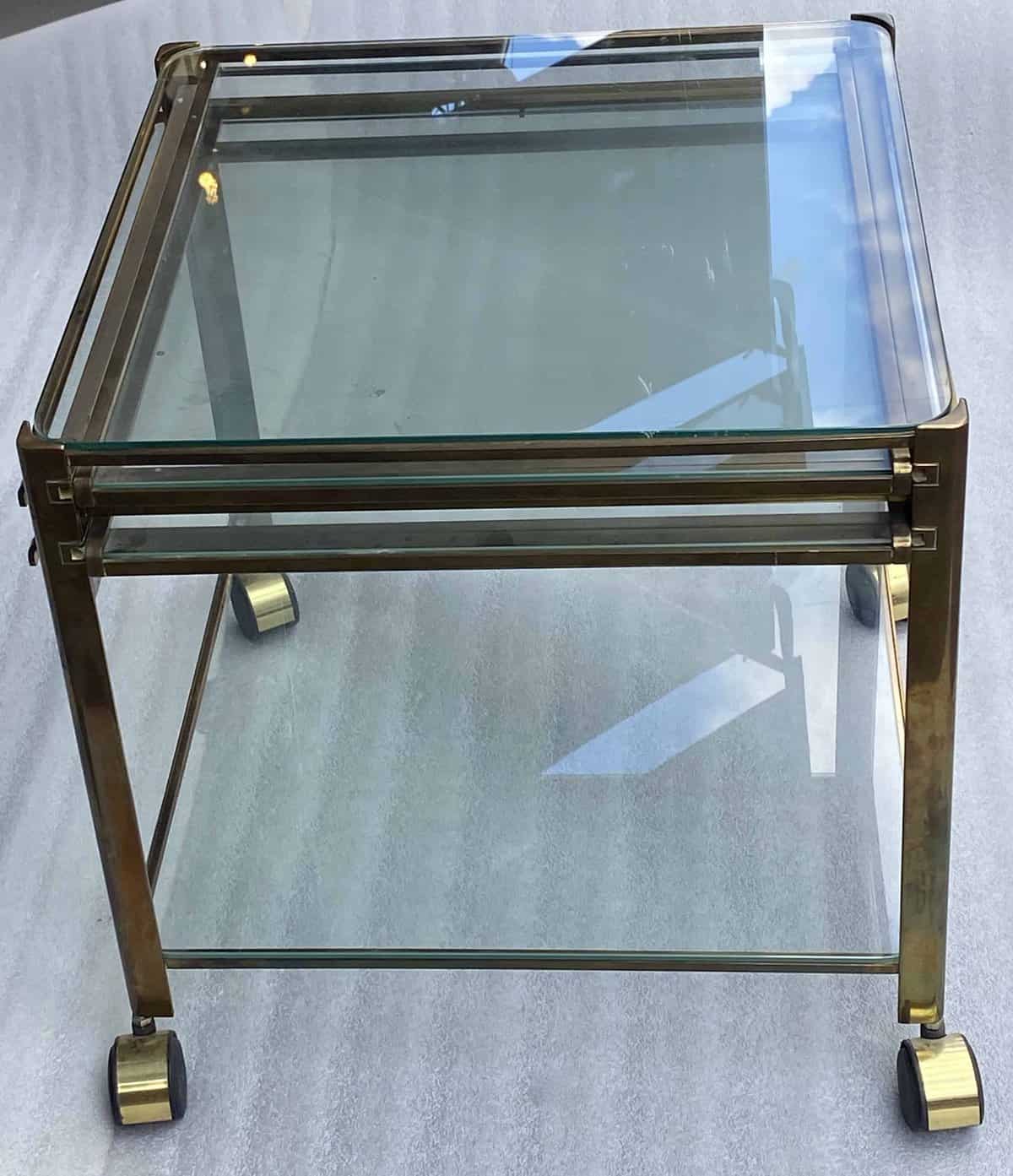 Desserte roulante à 2 plateaux en verre reposant sur un piétement en corniére en laiton patiné.