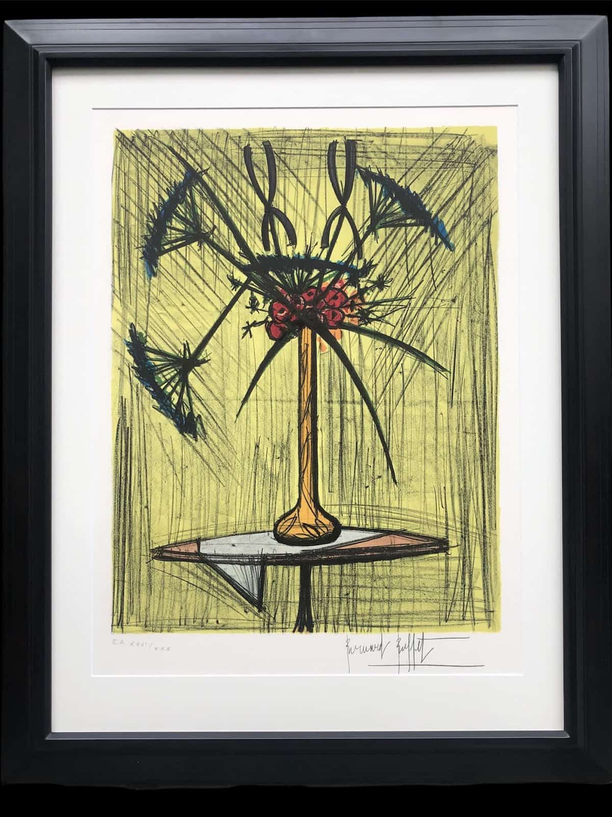 Rejetant toute forme d’art abstrait et d’impressionniste, Buffet plonge dans les grands traits noirs et les couleurs vive de l’expressionnisme composant aussi bien des personnages que des figures, clowns, animaux, nus, paysages, intérieurs, natures mortes, fleurs et peintures religieuses. Il peint partout autours du monde. Il se dévoue particulièrement au Japon, où un musée lui est entièrement consacré, a tel point que ses propres cendres y ont été dispersés. Son importante production fait toujours de lui un artiste actif et présent dans notre imaginaire malgré sa mort.