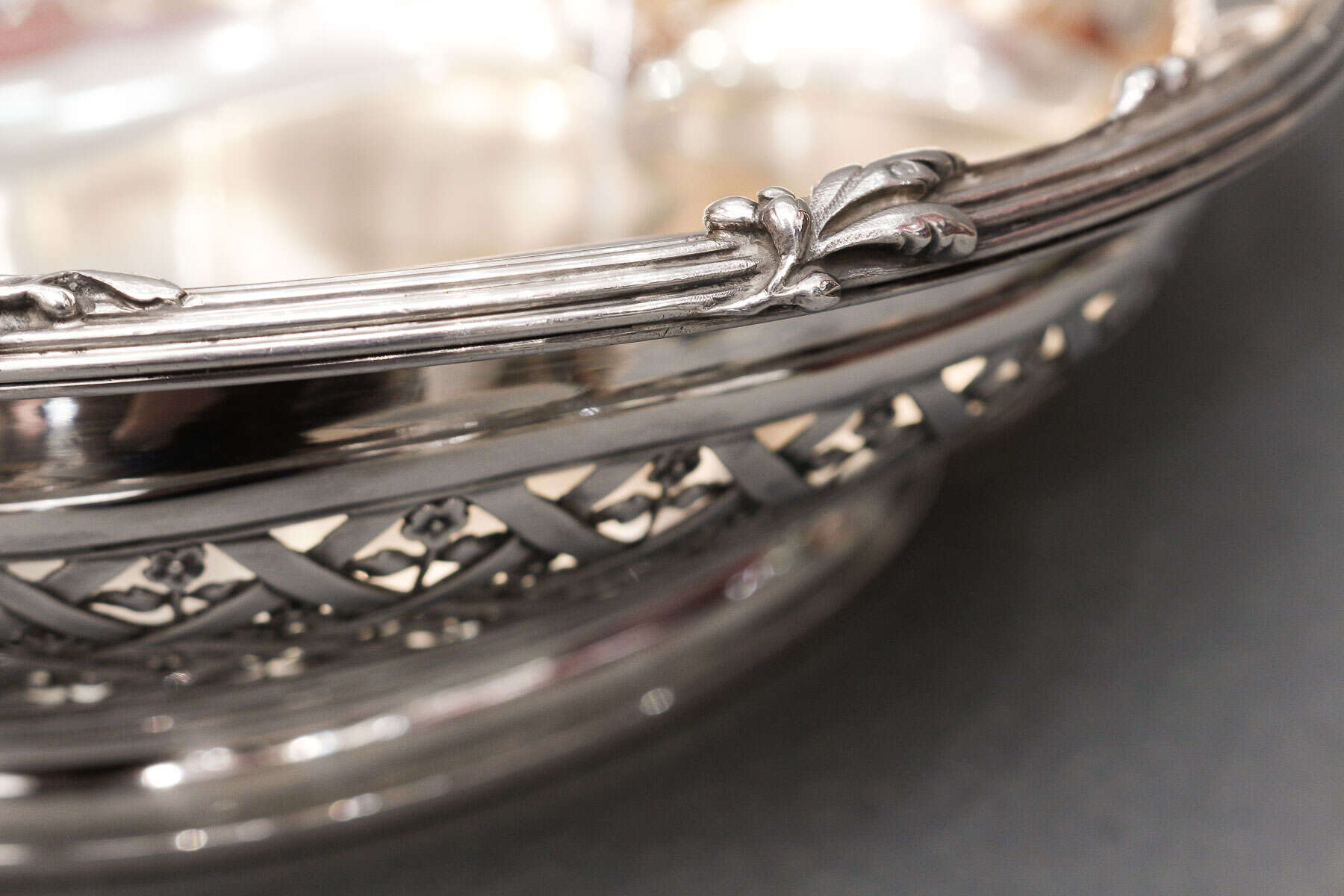 Grande Panière à fruits de forme polylobée en argent massif à décor de feuillage et agrafes. Le corps est ajouré et repercé d’un cannage agrémenté d’un semis de fleurs, flanqué de chaque côté d’anses en forme de feuilles d’acanthe et reposant sur une large bate.