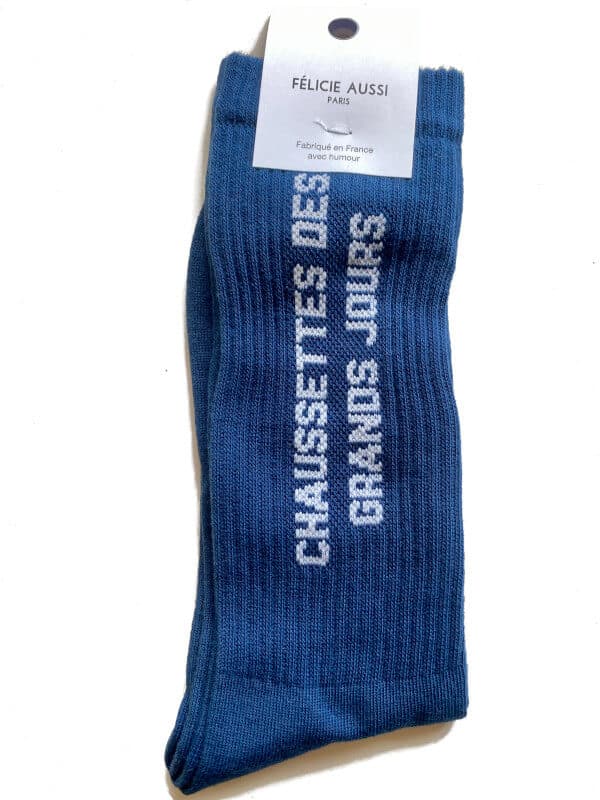 La marque Félicie Aussi présente une chaussette homme qui fera briller les yeux. Ce modèle, avec l’inscription « Grands Jours », est un accessoire qui célèbre la joie. Chaque chaussette de la marque Félicie Aussi est un concentré de bonheur.