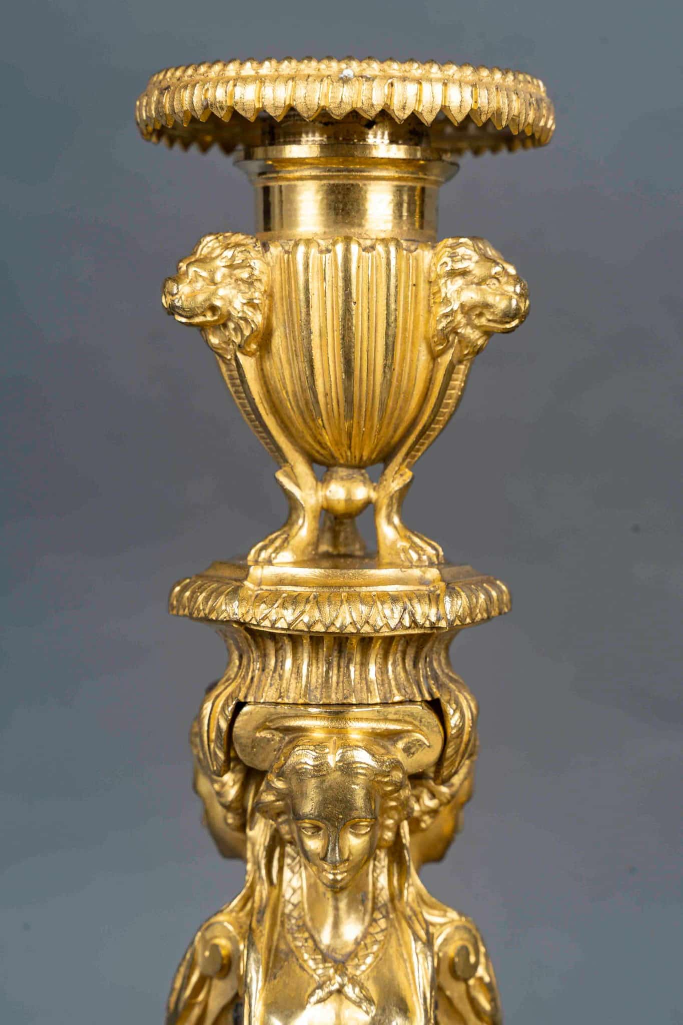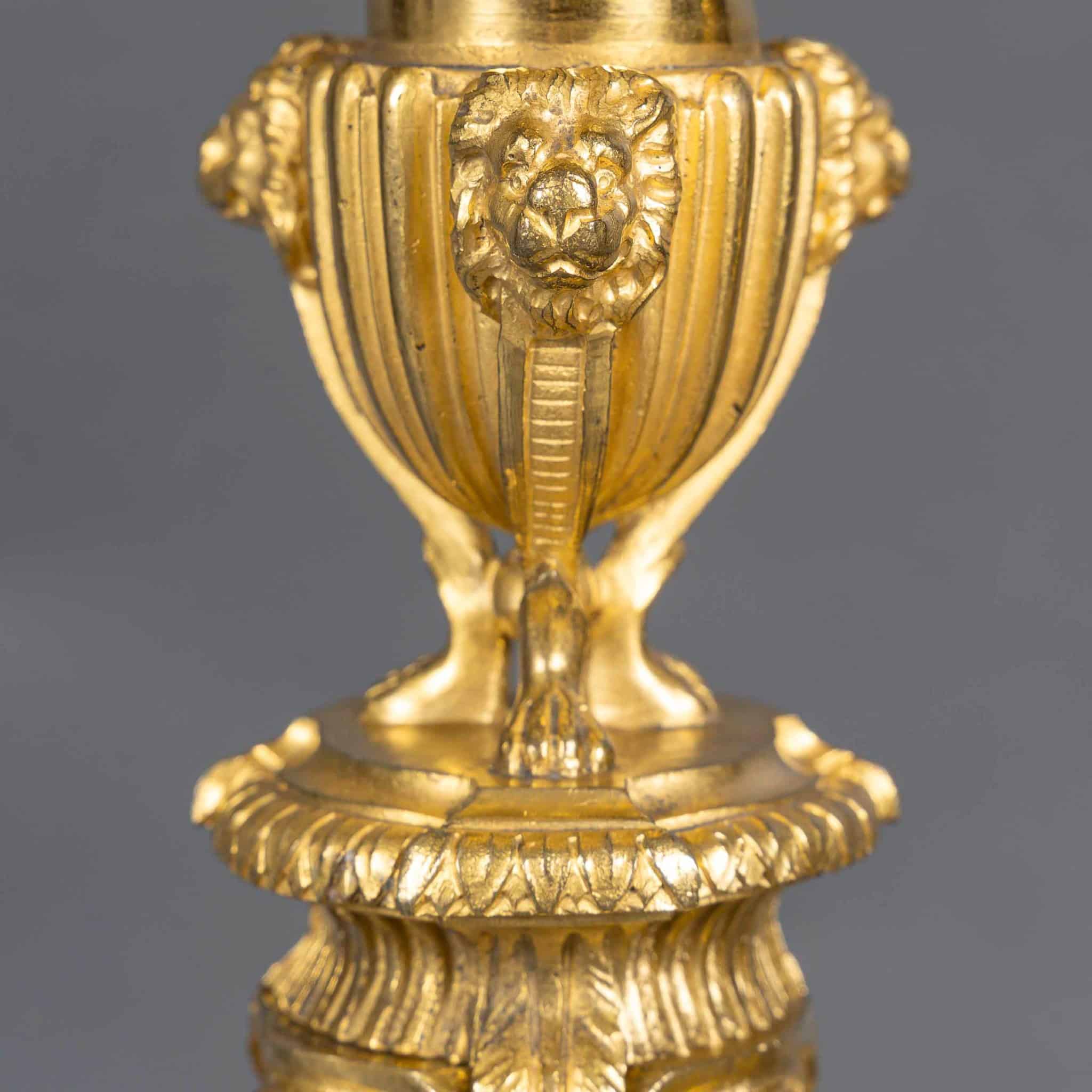 Cette rare et très décorative paire de flambeaux en bronze finement ciselé, dans sa dorure d’époque, est surmontée d’un vase à l’antique formant binet. Le fût est orné de trois termes féminins à mascarons Louis XIV sur la poitrine, agrémenté de guirlandes de fleurs, et se termine par trois paires de pieds en sandales. La base est décorée de feuilles d’acanthe et ceinte d’une frise de perles.