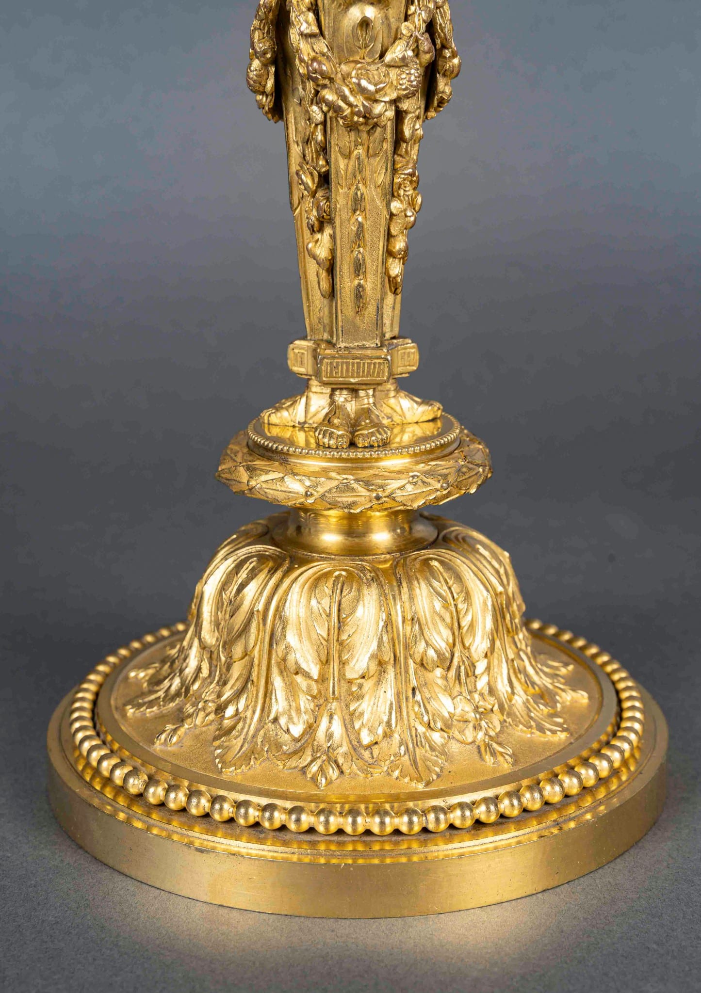 An identical model, dated 1785, is preserved at Pillnitz Castle near Dresden. Two other models of flambeaux, preserved at the Wallace Collection in London, also illustrate the collaboration between Dugourc and Rémond. The first model, dating from 1783, features a shaft with four terms supporting an octagonal base adorned with rosettes and satyr heads, commissioned by the merchant-haberdasher Dominique Daguerre.