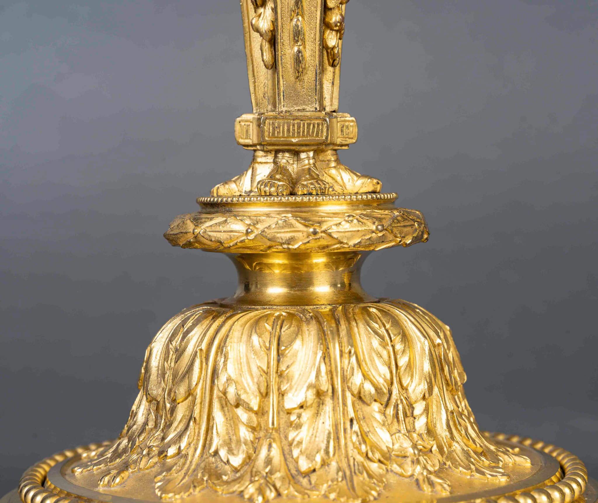 François Rémond, a master chaser-gilder since 1774 and also a founder, drew inspiration from a drawing by Jean-Démosthène Dugourc, dated 1790 and preserved at the Musée des Arts Décoratifs in Paris, to create this magnificent pair of flambeaux in the Etruscan-antique style.