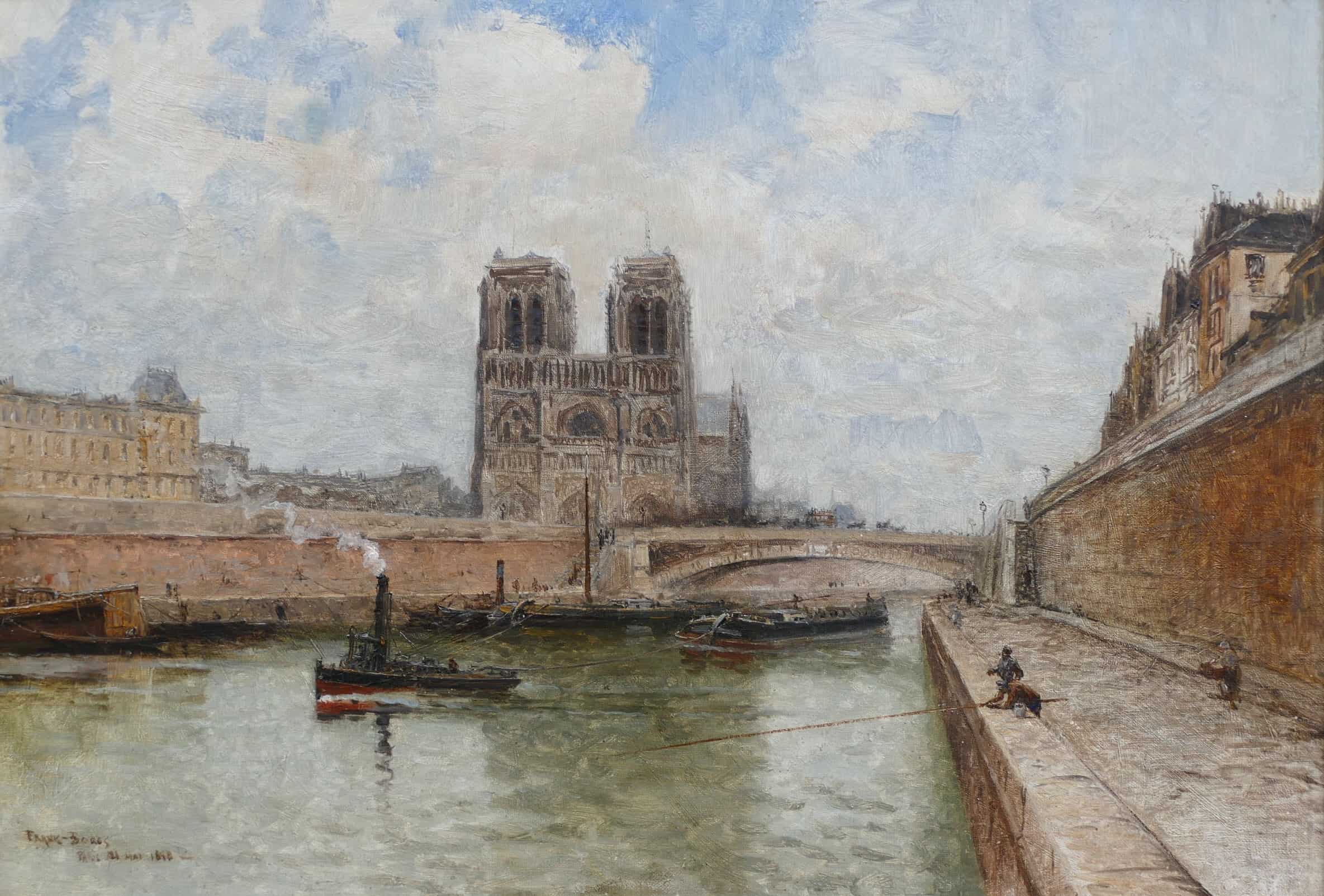 A Paris, il fut élève à l’école des Beaux Arts puis exposa régulièrement au Salon des Artistes Français – En 1885, il a exposé à New York et à Chicago en 1893 aux côtés des impressionnistes américains .Amoureux de Paris, de ses quais et de ses monuments, attaché aux bords de la Seine tout eu long de son cours – insatiable admirateur des ports français et étrangers, il a multiplié les vues de ces sites dans des peintures solidement bâties – aux ciels balayés de nuages, souvent couverts. – Ainsi F. Boggs peint en Normandie, en Bretagne, en Hollande, en Angleterre et à Venise – Ses motifs de prédilection sont les fleuves et les ports dont l’élément aquatique lui permet de suggérer les multiples nuances de l’atmosphère.