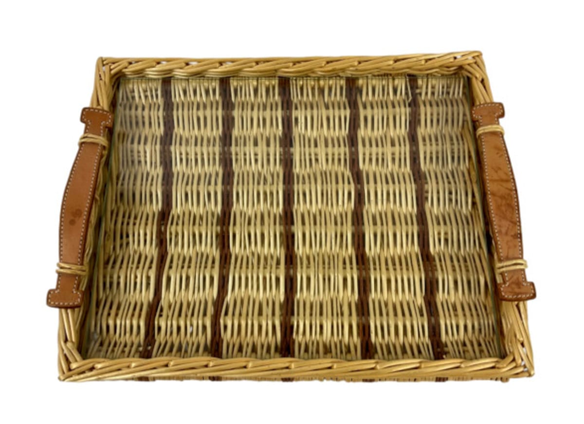 « Oseraie » Petit plateau rectangulaire en osier naturel, les prises en cuir surpiqué, gold et patiné brun