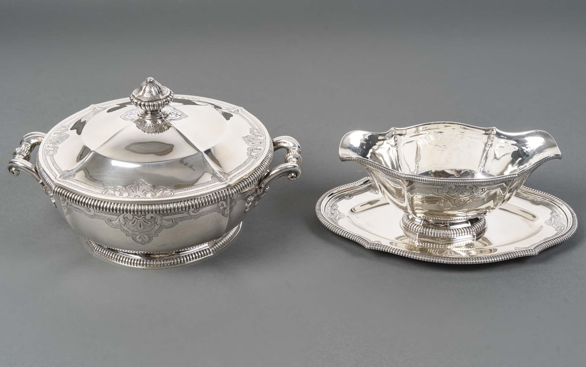 Garniture de table en argent composée d,un légumier et d’une saucière. Décor de godrons et d’une gravure à la Bérain sur fond amati. Les anses des légumiers sont à enroulement.
