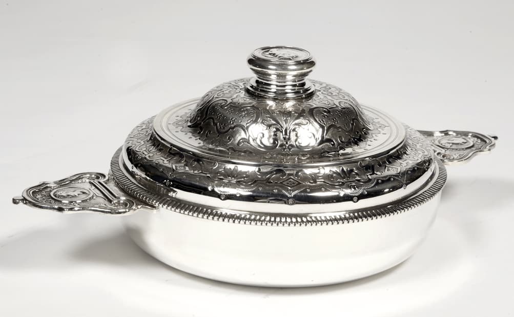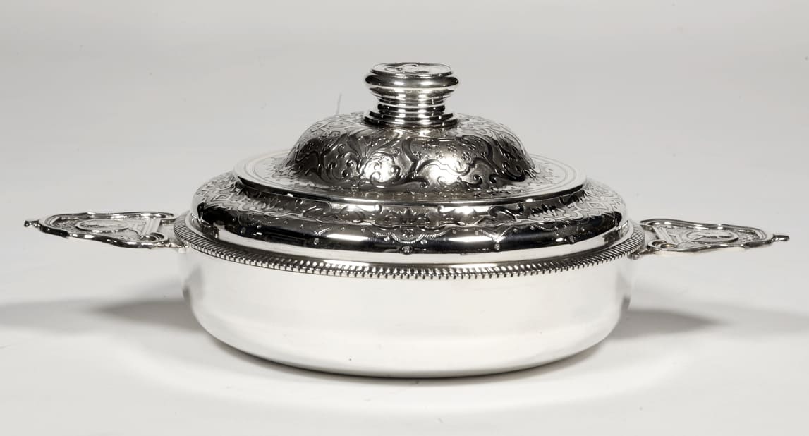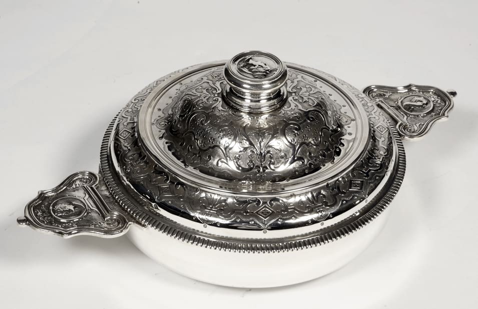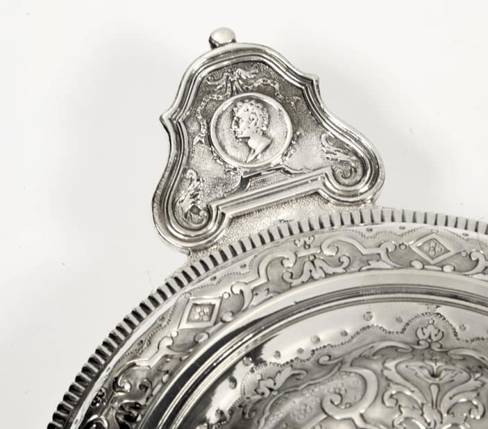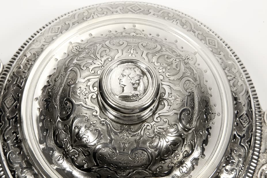 Légumier en argent de forme ronde. Le corps uni est flanqué de deux anses latérales à oreilles présentant un médaillon sur fond amati ciselé d’une tête d’homme d’un côté et d’une tête de femme de l’autre. Le couvercle à pourtour de godrons, est formé d’une double doucine entièrement ciselée d’un décor à la Bérain sur fond amati et surmonté d’une prise sur laquelle est inserée un médaillon gravé d’une tête de femme.