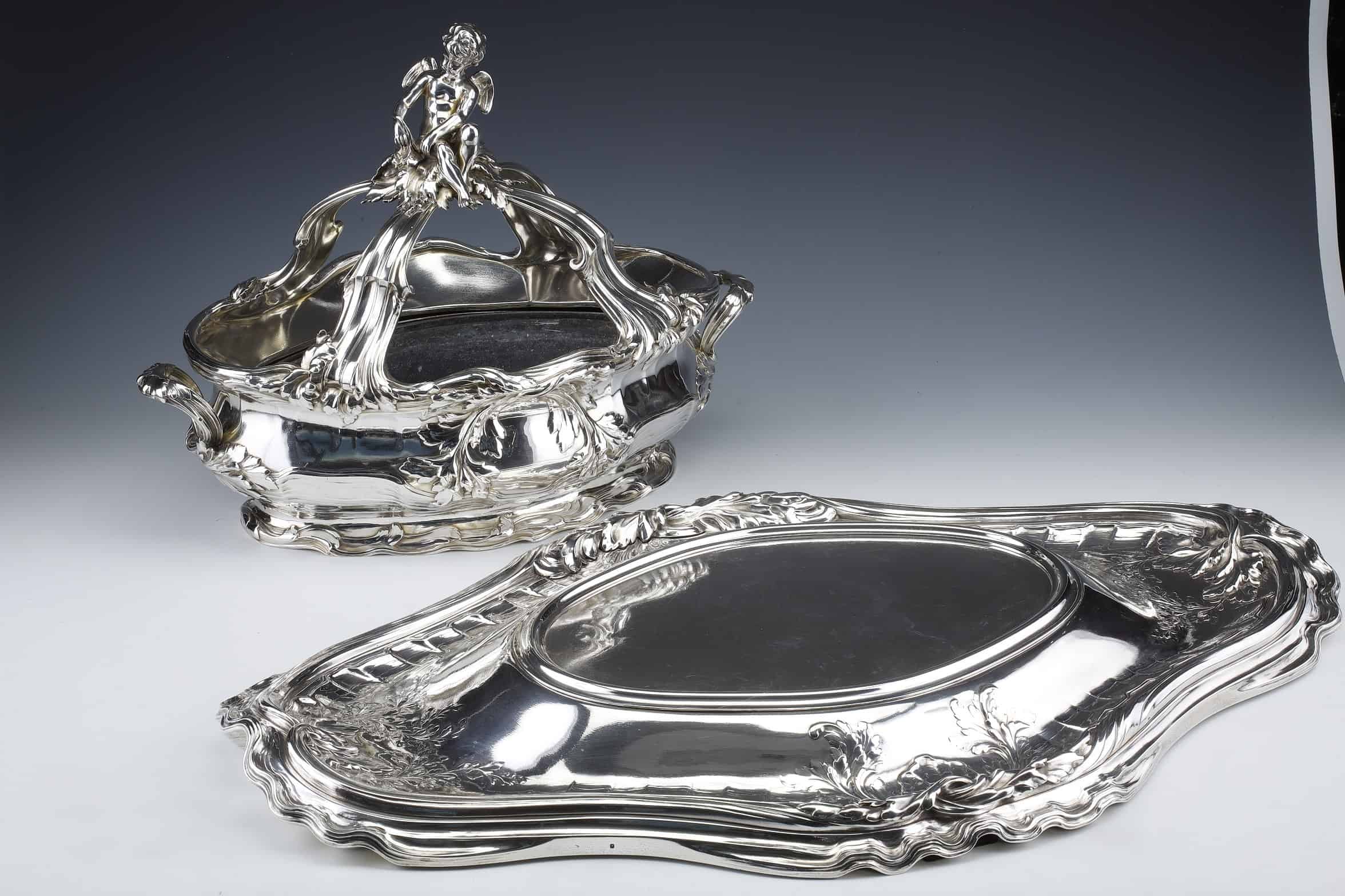 Important centre de table en argent massif en deux parties formé par un plateau décoré de vagues et une jardinière surmontée d’un putti, à décor de coquillages et crustacés.