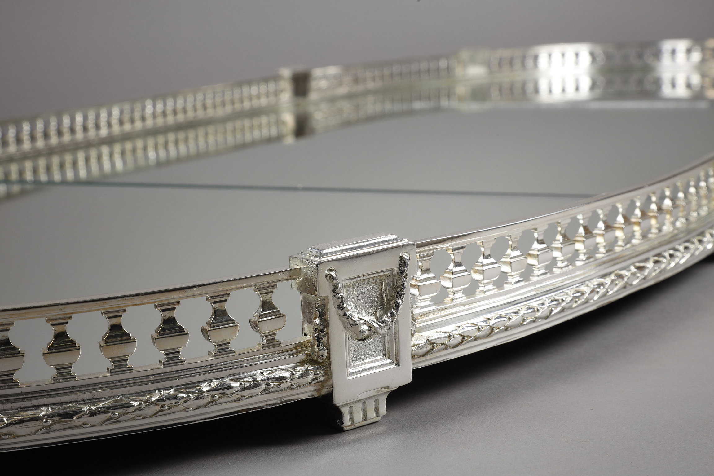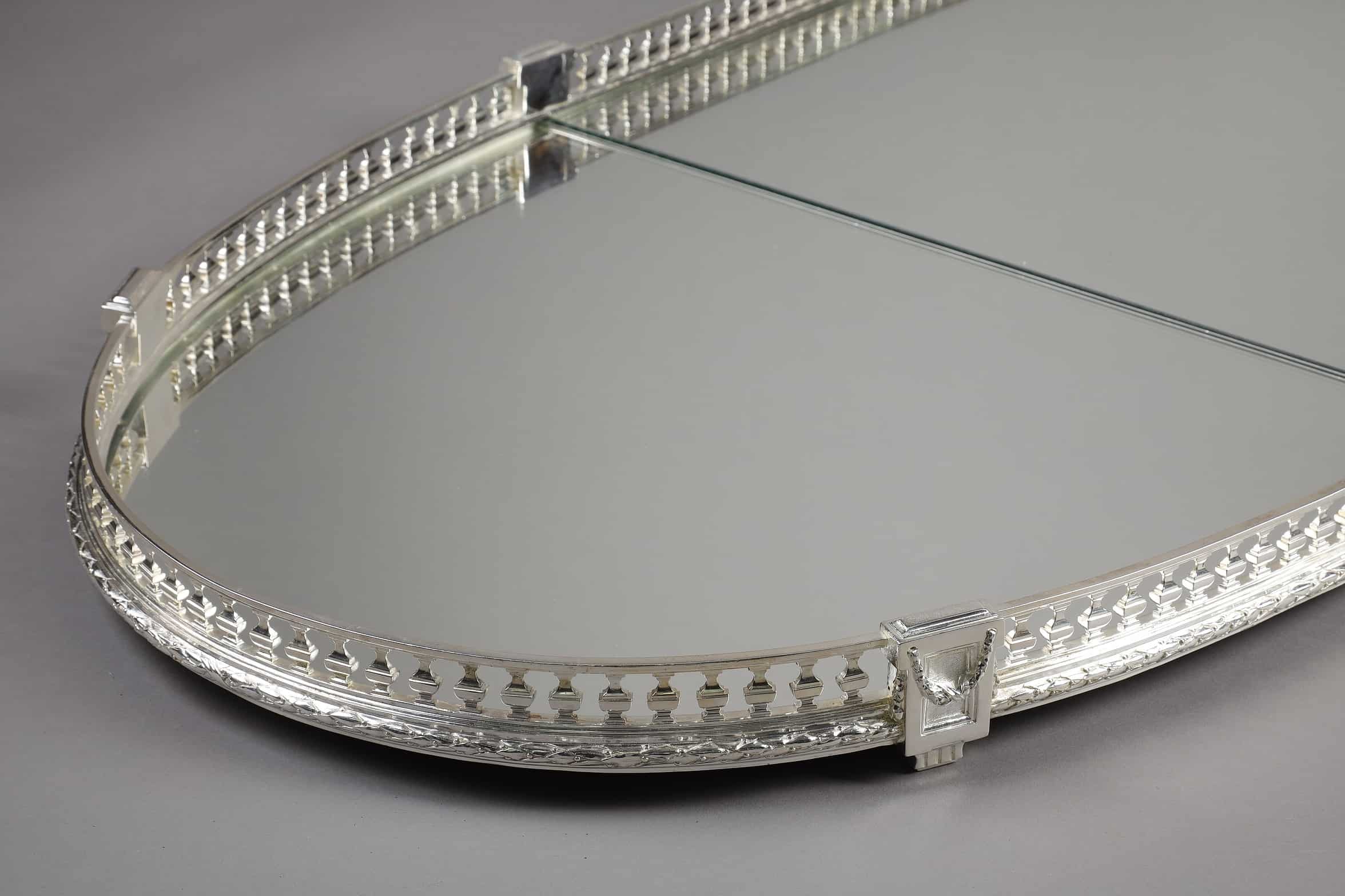 Surtout de table en trois parties de forme ovale, à fond de miroirs, ceinturé par une grille en bronze ponctuée de chapiteaux formant les pieds. Finition feuille de laurier. Les miroirs ont été changés et les fonds sont recouverts de tissu bleu.